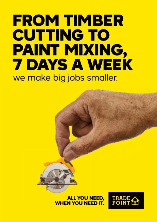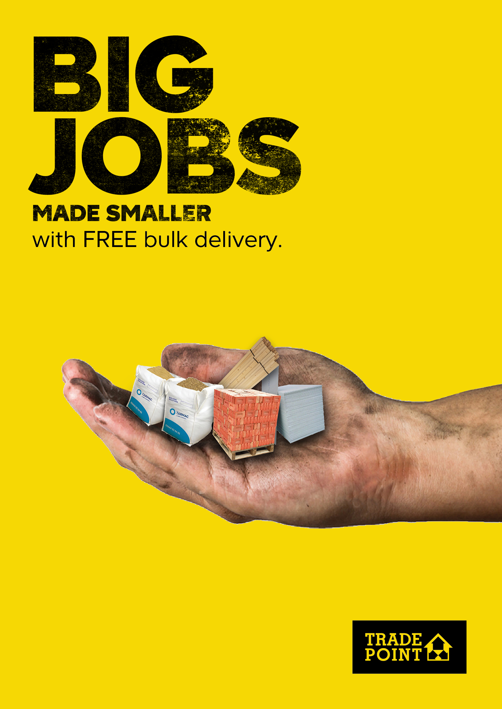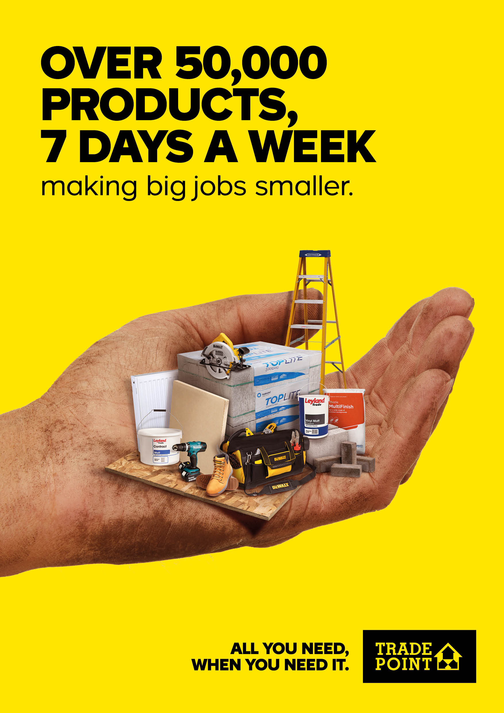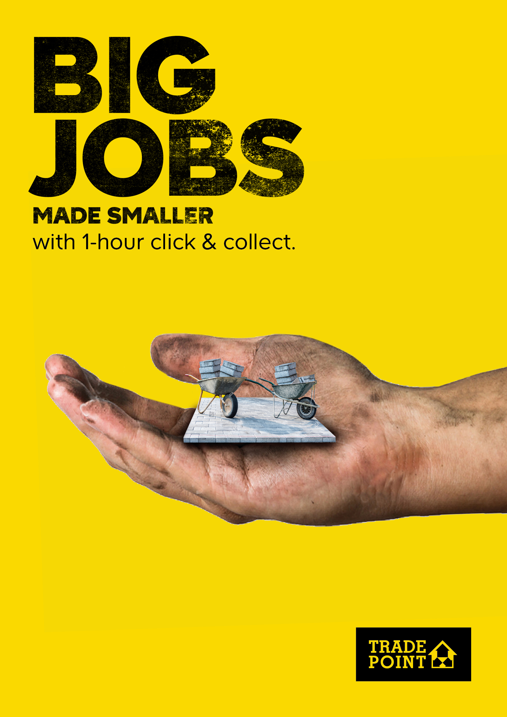 Tradepoint is the trade arm of B&Q and it doesn’t get quite the attention and love as it’s big brother. We were tasked with giving the brand a bit more oomph and standout. Tradepoint’s core USP is that they make life easier for tradespeople, so we landed on the idea that they make even biggest, most arduous of jobs feel that much smaller.